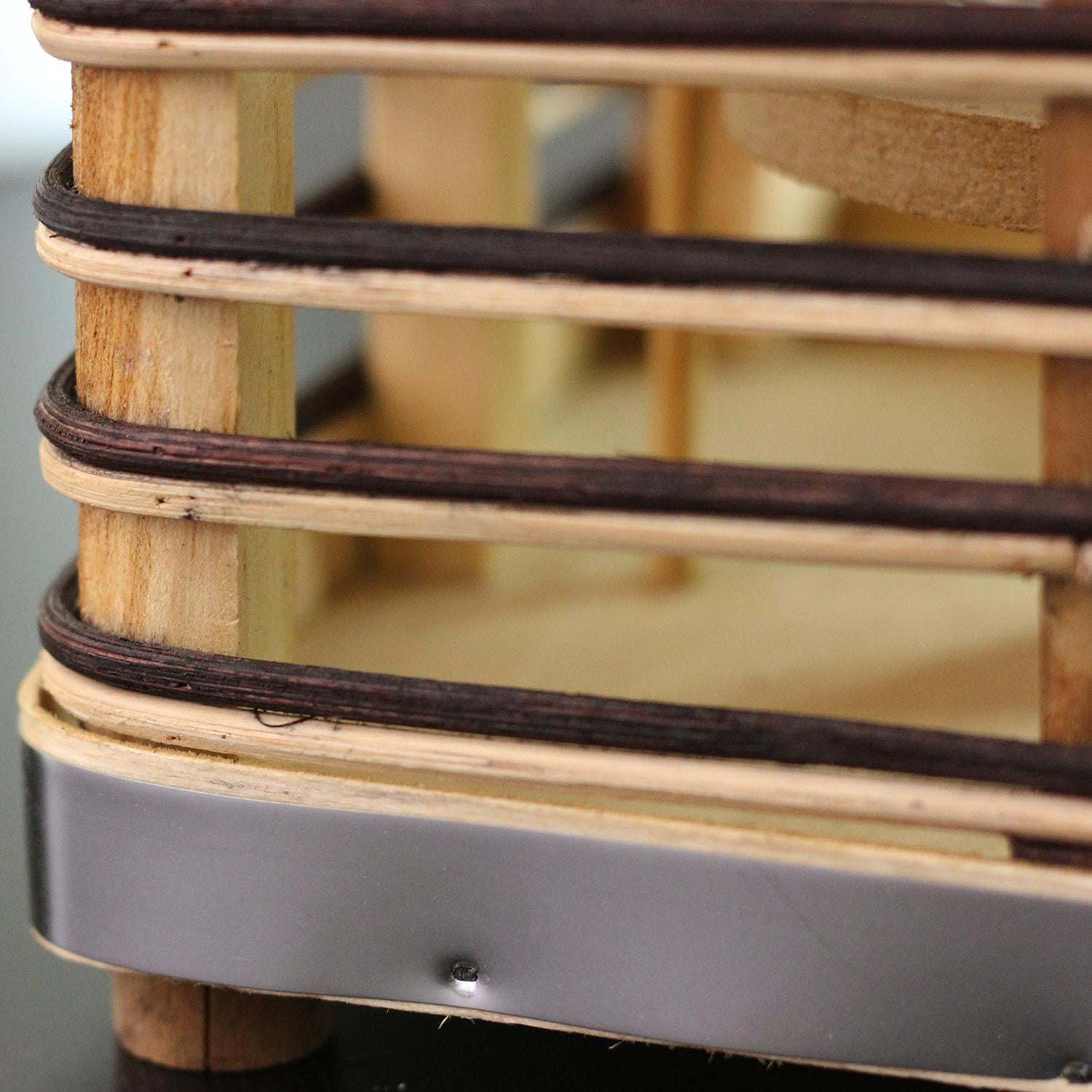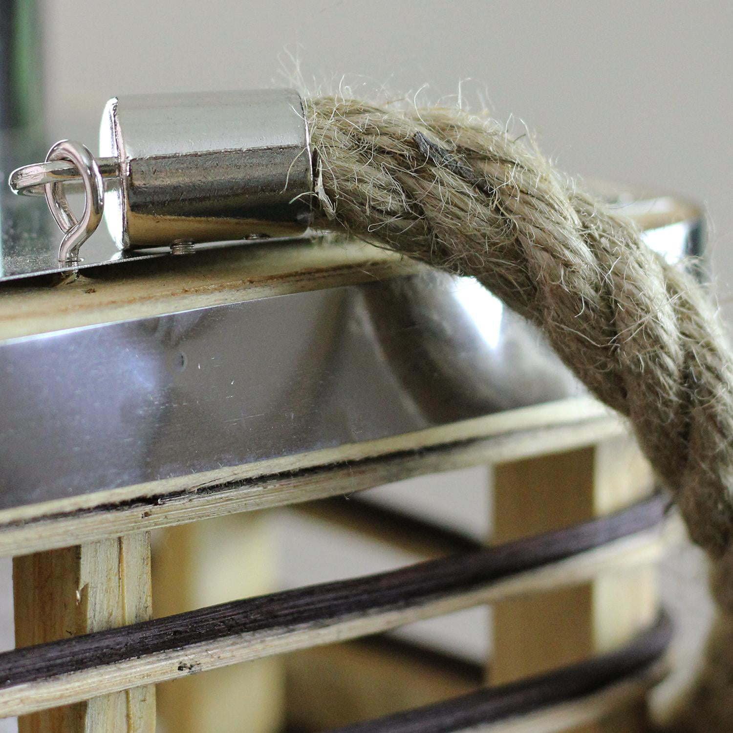 This open aired lantern features horizontal stripes of natural and dark stained rattan with striking metallic finishes