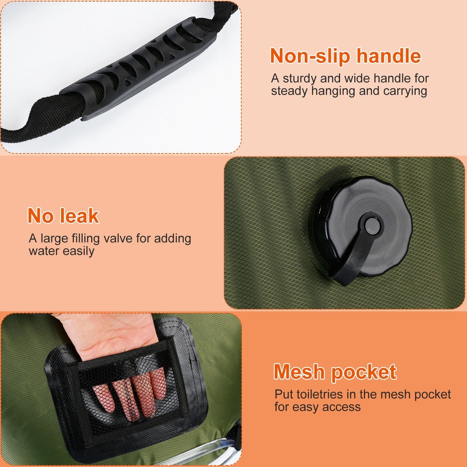 *Humanized Design*:The sturdy handle allows you to hang it on the tree for better heating effect. The strap close to the bottom can be used to fix the hose during shower. Besides; you can put toiletries in the mesh pocket for easy access. Fold it like a bag to save space when not in use.