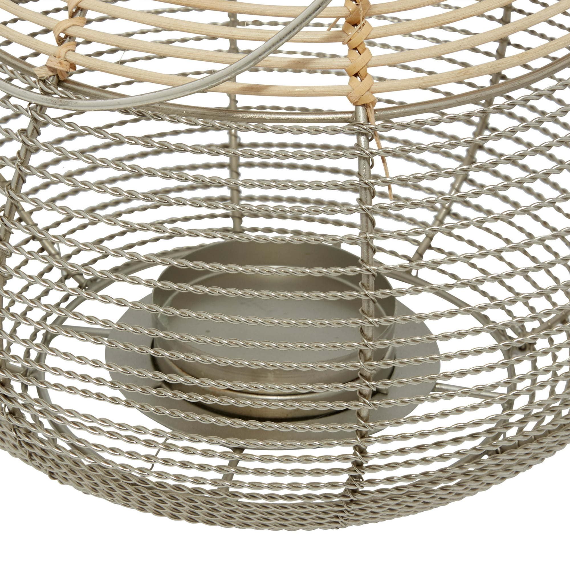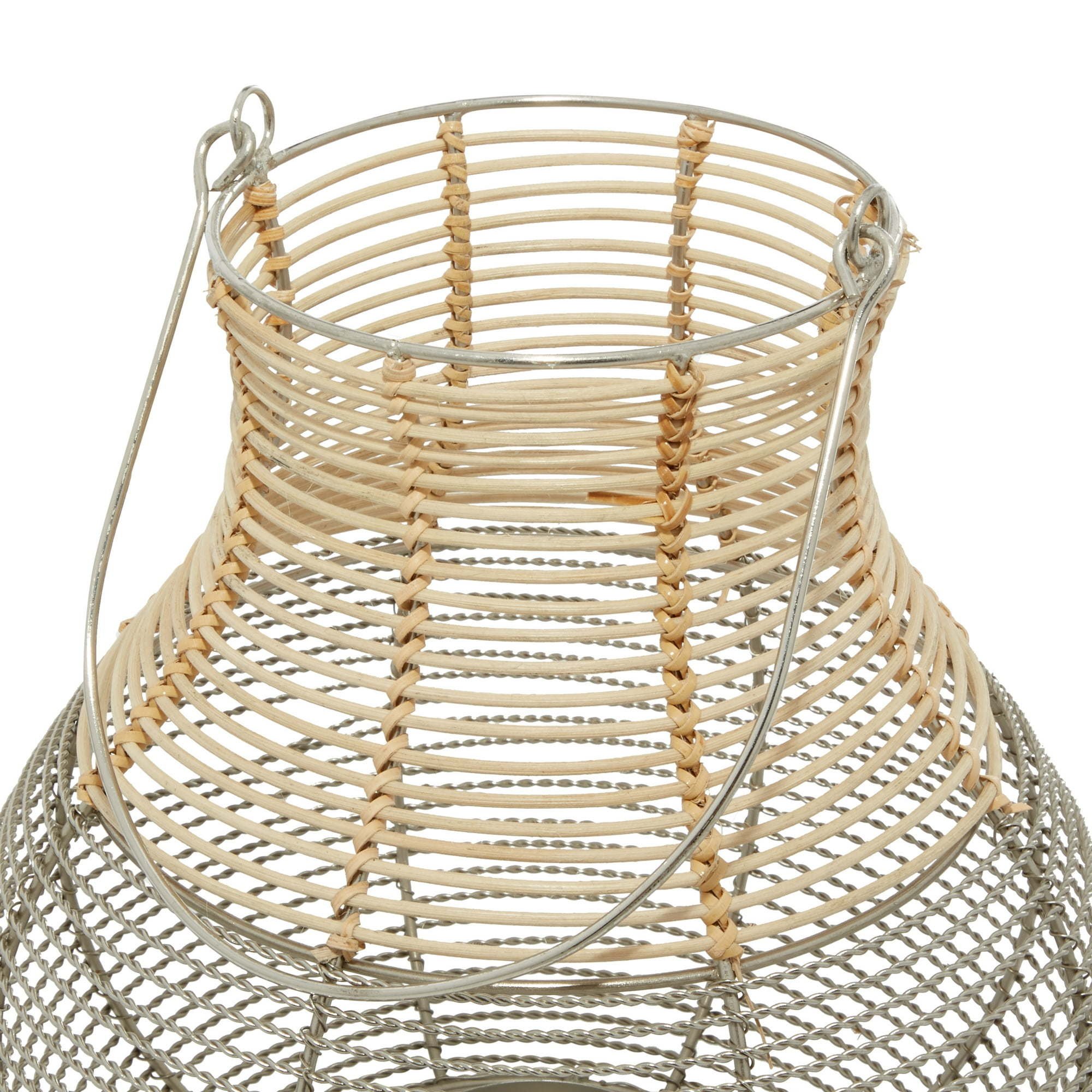 It can serve as a centerpiece, tabletop decor, and pillar candle and tea light holder. Appreciate the decorative holes best against a neutral-colored background and brown wood surfaces. Set the scene and light some candles to create warmth and joy in your living space featuring this delicate lantern. Round shaped with horizontal weaving pattern. This item ships in 1 carton. Set the scene and light some candles to create warmth and joy in your living space featuring this delicate lantern. This candle lantern is meant to sit on top of surfaces but it can also hang via its metal handle. Suitable for indoor use only. Made in India. Contemporary design. Lantern candle holder can hold 1 pillar candle.