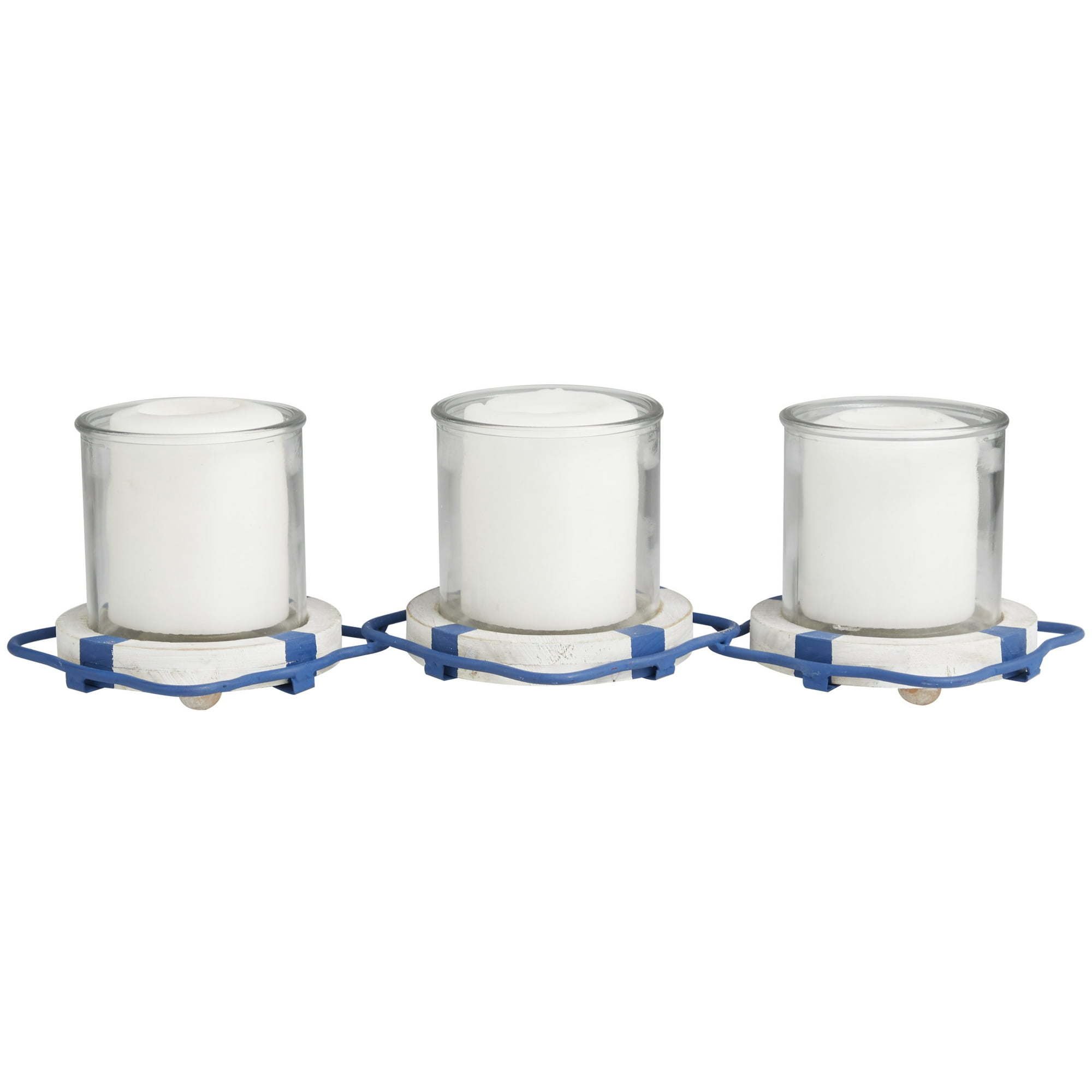 Coastal candle set highlights a distressed white wood finish with matte blue iron detailing and clear glass holders