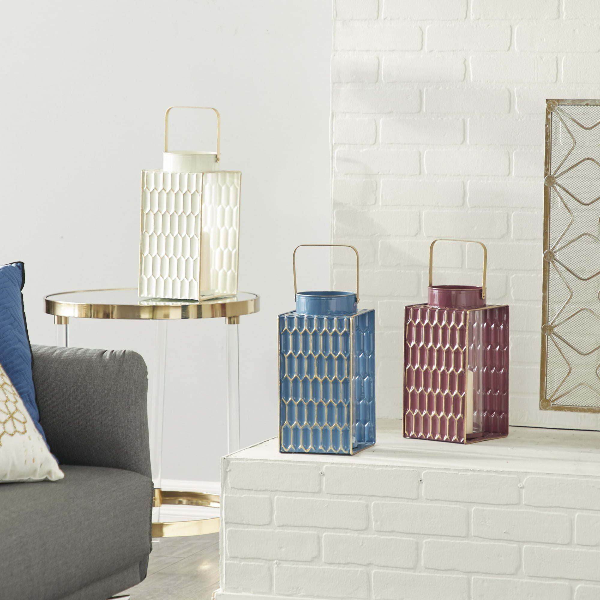 DecMode 8"W, 13"H Contemporary Lantern, Multi Color, 3 - Pieces is a unique addition to your stylish home. These coastal style inspired design lantern candle holders will add warmth and light when displayed together on shelves, tables, or display separately in different rooms for light ambiance glow. Brighten up your space with these decorative lanterns crafted from solid metal. These gold metal and glass lanterns feature a gold honeycomb design that bring out a blend of contemporary and bohemian vibes. This set includes three lanterns in blue, maroon and white finishes with square handles on top. Use with your favorite pillar candles and display on any flat surface. This item ships in 1 carton. Metal handle for easy displaying. Suitable for indoor use only. This set includes 3 lantern. Coastal design. Lantern pillar candle holder with 1 pillar candle each.