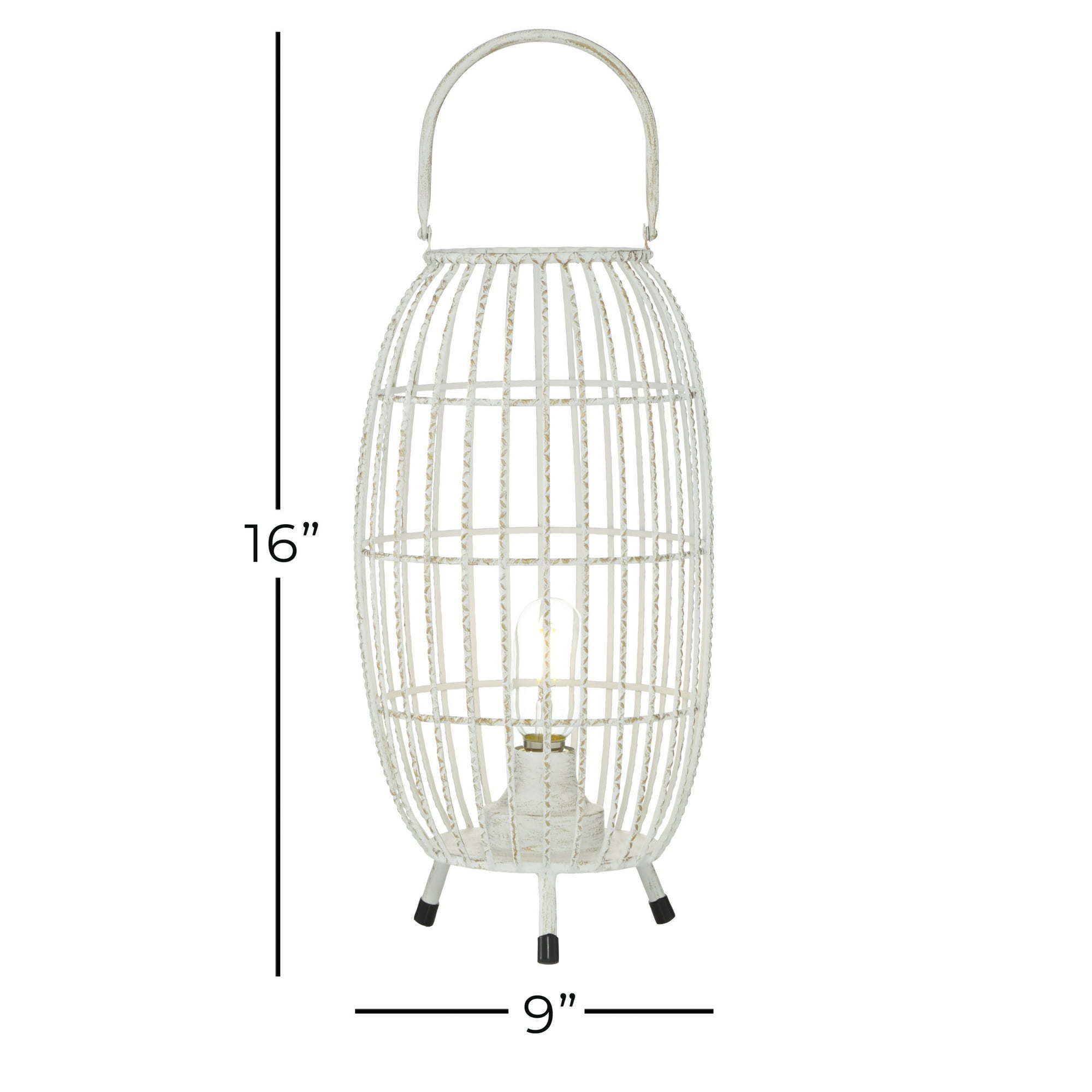 DecMode 9"W, 16"H Metal Modern Candle Lantern, White, 1 - Piece is a unique addition to your stylish home. Use this LED lantern to brighten up your modern living room, bedroom, or entryway. Delight your guests and make any occasion extra special by adding a lighted or flameless candle to this lantern. Made with a sturdy base, it is perfect for creating an elegant atmosphere at your table top or mantel. Designed with black rubber stoppers at the base that prevent scratching furniture and table tops, as well as sliding around. Runs on one AA battery. Features LED light bulb. This is an LED lantern and does not hold candle. This item comes shipped in one carton. Suitable for indoor use. Modern design.