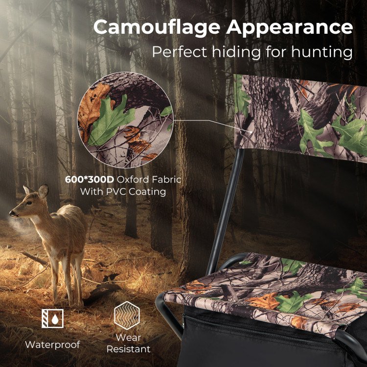 1.Premium Material and Cozy Sitting: Made of high-strength oxford fabric in hidden nature patterns, the blind chair is friendly to hunting. Besides, the humanized and foldable backrest provides firm support while the widened seat allows you to sit more comfortably without feeling tired.