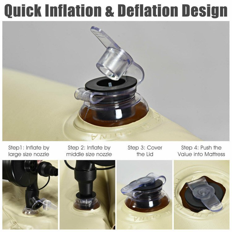 1.Fast Inflation and Deflation: You can quickly inflate or deflate the airbed to desired firmness within minutes, and the firmness is adjustable according to your needs. To inflate the mattress, you can simply plug the pump into the car's cigarette lighter socket and pump air into the mattress with nozzles.