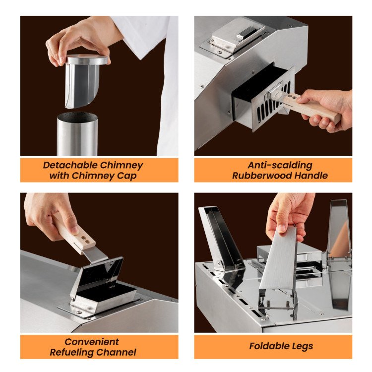 -Detachable chimney and foldable legs for easy carrying and storage