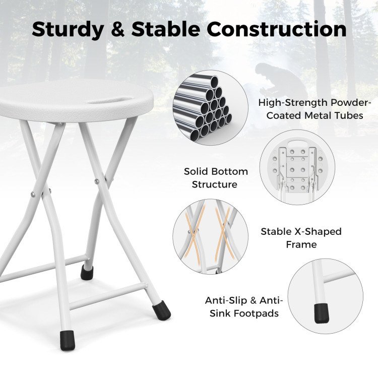 2.Sturdy & Stable Construction: The outdoor foldable stool is built with high-strength powder-coated metal frame and reinforced by a solid bottom structure, offering excellent sturdiness and support. Moreover, the X-shaped frame and anti-slip footpads further enhance its stability and prevent wobbling.