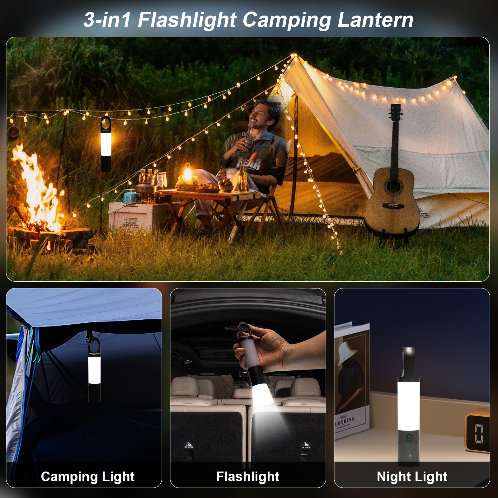 • 【Magnetic Suction Hook for Versatility】 Designed with a convenient magnetic suction hook, you can hang this camping light inside your tent, carry it with you, or simply place it on a surface with iron, the ground, or a table. It's powered by rechargeable batteries (included) for your convenience .